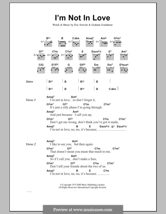 I M NOT IN LOVE Chords - The Pretenders E-Chords I m Not in Love Chords by The Pretenders Learn to play guitar by chord and tabs and use our crd diagrams, transpose the key and more. Im Not In Love Chords (ver 2) by 10cc m. Not in love ft robert smith by Crystal Castles. Not In Love Chords by Enrique Iglesias with chord diagrams, easy version and transpose.